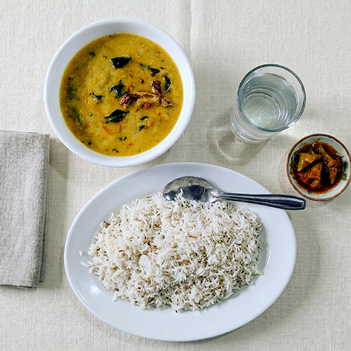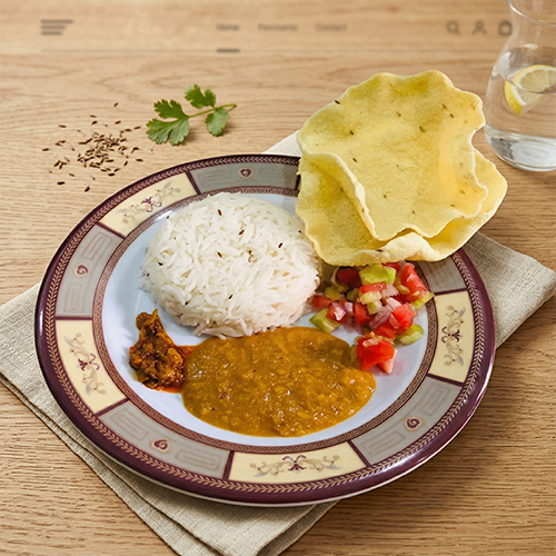 Slow-simmered lentils cooked with golden onions, tomatoes, and warm spices finished with a sizzling tarka of cumin and dried chillies. Served over fluffy basmati rice. Simple, soulful, and timeless.
