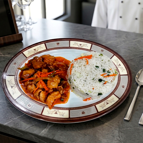 Crispy golden chicken tossed in a bold, tangy Indo-Chinese sauce of garlic, ginger, soy, and chilli served over fluffy basmati rice. A homestyle Pakistani-Chinese favourite, full of flavour and comfort.