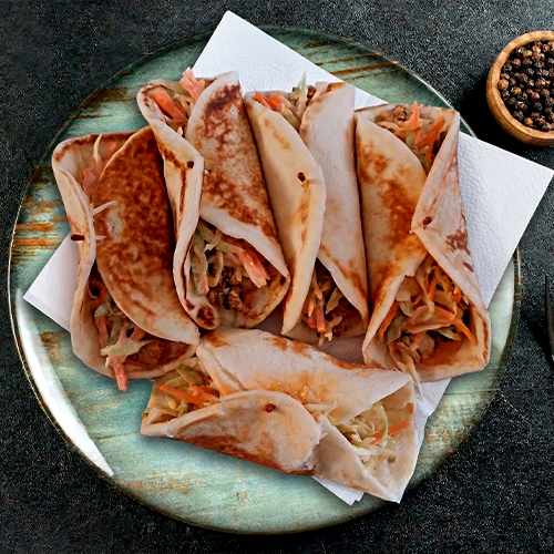 Tender marinated chicken layered with crisp veggies, creamy garlic sauce, and tangy chutney all wrapped in a soft, warm flatbread. A street-food classic packed with bold, irresistible flavour.