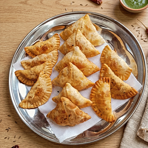 Crispy D-shaped samosas filled with perfectly spiced mashed potatoes, fried to a golden, crunchy perfection.