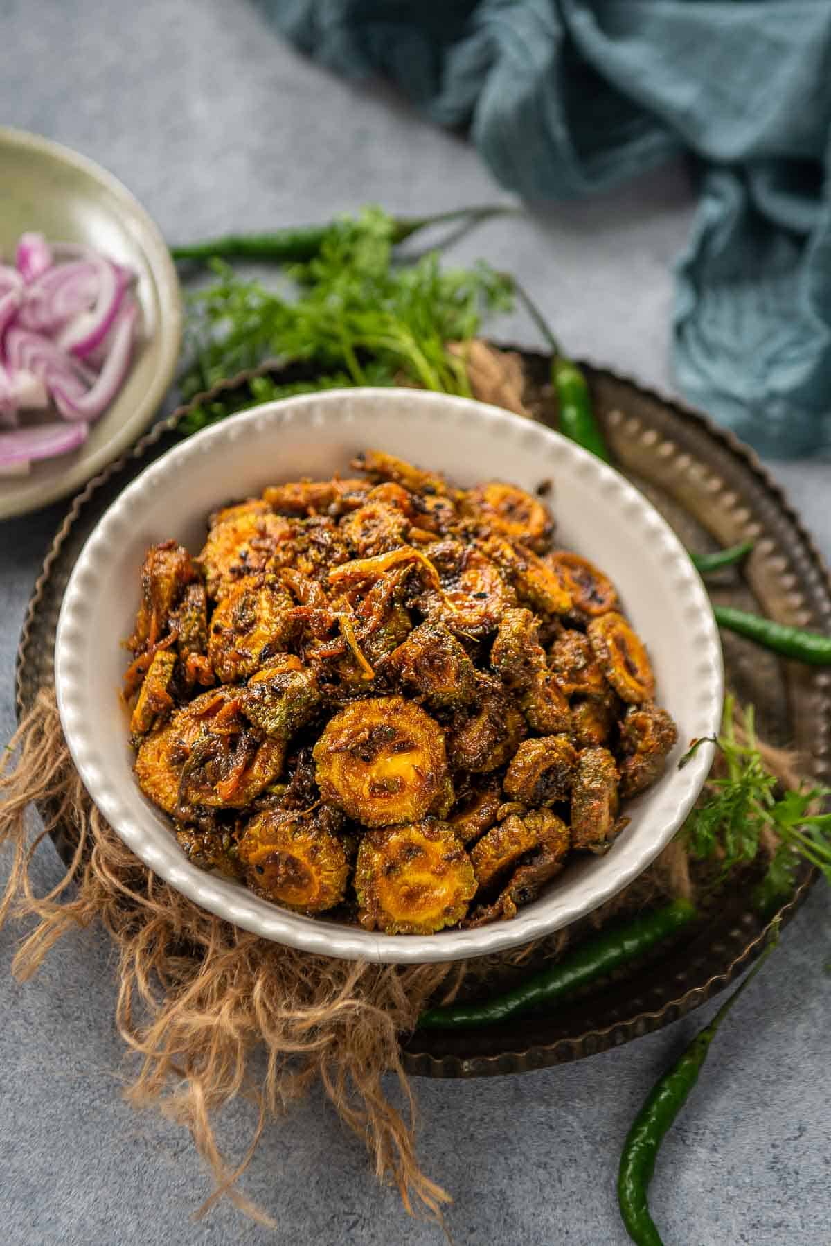 Tender bitter gourd lightly spiced, pan-fried to a golden crisp, and tossed with caramelised onions and simple homestyle masala. A clean, wholesome everyday dish full of earthy flavour.